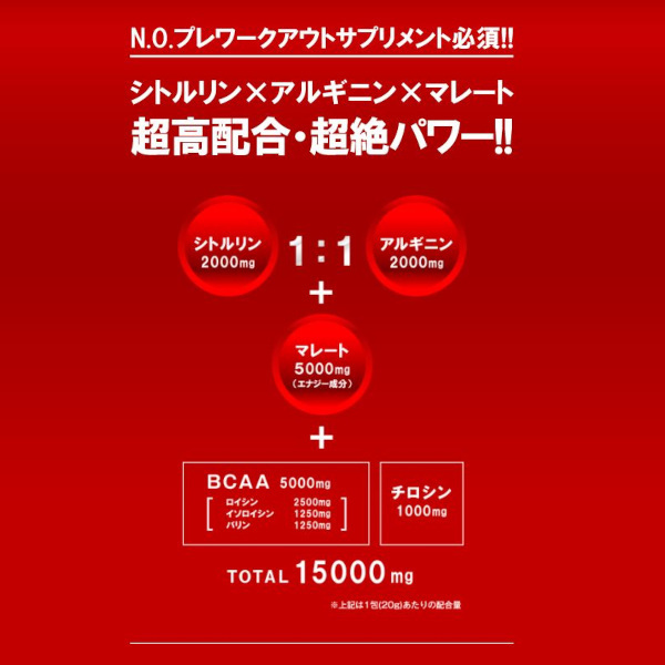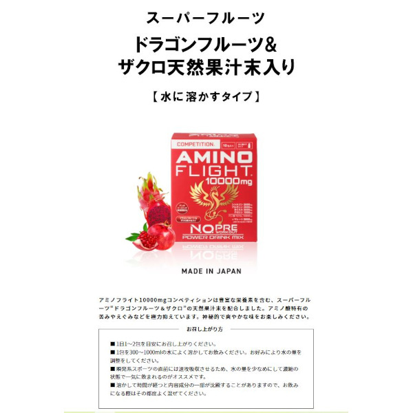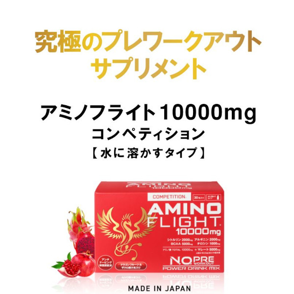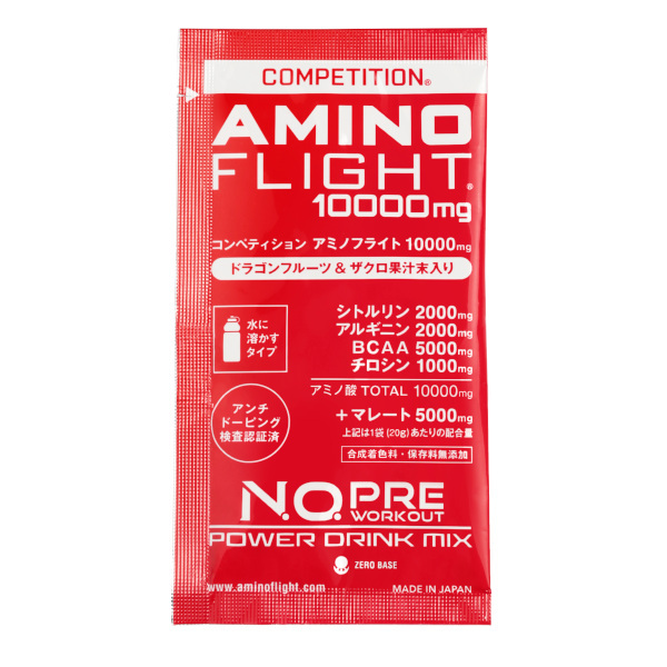 Amino Flight 10000mg Competition 3-piece pack 勝利へのパワー: N.O.プレワークアウトサプリメント 世界で活躍するアスリートの競技用サプリメントとして開発された商品です。 また、毎日のトレーニング、ダイエットエクササイズ、減量期、試合直前や練習の追い込み時期のみならず、大切なプレゼンや会議、テストや試験勉強の直前、シニアの方の活力にも速攻で素晴らしいパフォーマンスを発揮します。 速攻パワーお試し3包セット。 究極のアミノ酸サプリの速攻パワーをお試しになる方にもぴったりなハンディサイズです。 内容量:3包入パック (20g x 3包) 水に溶かすタイプ 日本製 Made in Japan アンチドーピング認証取得済み ポイント対象外商品:この商品にはポイントは付与されません。 速攻20分でスピード吸収! ◆瞬発・集中・持久・燃焼・筋肉・回復系アミノ酸10000mg配合! ◆シトルリン 2000mg X アルギニン 2000mg 1:1 同量・高配合で一気にパフォーマンスUP! ◆シトルリン X マレートの相乗パワーでエネルギーサイクルを加速! ◆BCAA 5000mg と チロシン 1000mgも加え、驚異のアミノ酸 10000mg + マレート 5000mg! ◆スーパーフルーツと呼ばれるドラゴンフルーツ&ザクロ天然果汁末配合。アミノ酸特有の苦みやえぐみを極力抑え飲みやすくフルーティな味で美味しさと栄養UP! 高品質で安心・安全 ◆アンチドーピング認証取得済で安心・安全 ◆日本GMP認定工場にて製造の国産で安心 ◆一回飲み切り密封スティックタイプで衛生的 ◆シトルリンやアルギニンの同時配合による有効性に関して協和発酵バイオ(株)が日米特許を取得しており高い信頼性 ◆原料のアルギニンやシトルリンには医薬品原料メーカーの協和発酵バイオ(株)がアスリート向けに提供する、高純度アミノ酸の使用でさらに安心・安全 こんな方におすすめ ◆ここ一番、勝負を懸ける方 ◆厳しい減量期の選手やダイエット中の女性 ◆仕事や試験勉強の追い込みをするビジネスマン/学生 ◆活力を求めるシニアの方々 ◆高いパフォーマンスを期待されるアスリート ◆試合やレースに出場する選手 お召し上がり方 ◆1日1~2包を目安にお飲みください。 ◆1包を300~1000mlの水によく溶かしてお飲みください。お好みにより、水の量を調整してください。 ◆瞬発系スポーツの直前には速攻吸収させるため、水の量を少なめにして濃縮の状態で一気に飲まれるのがオススメです。