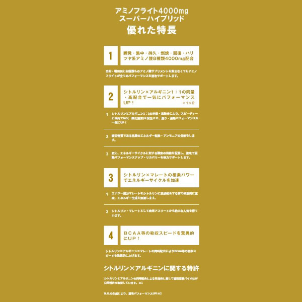 ◆シトルリンやアルギニンの同時配合による有効性に関して協和発酵バイオ(株)が日米特許を取得しており高い信頼性