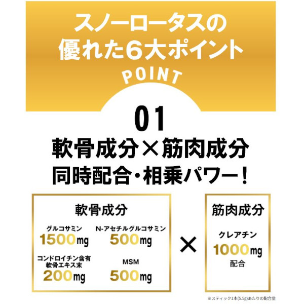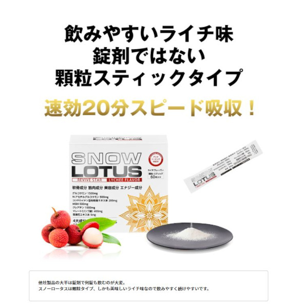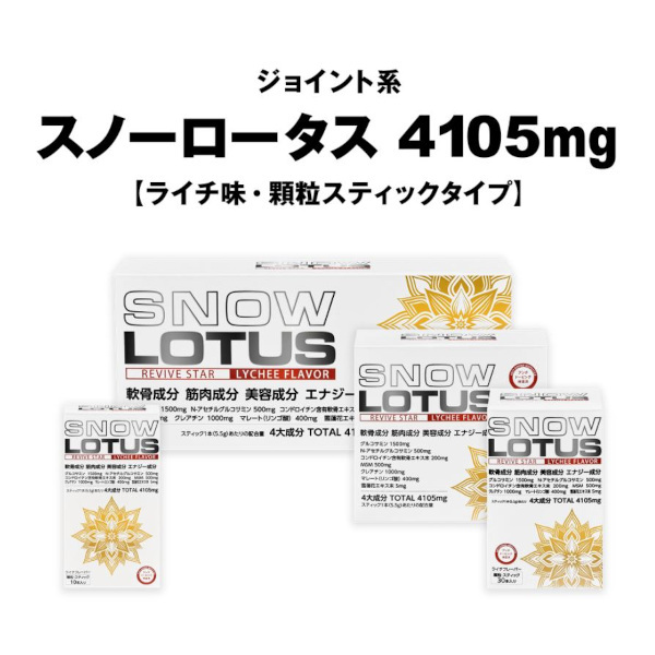 SNOW LOTUS 4105mg Revive Star 60-piece pack 究極ジョイント系サプリメント。パワフルかつスムーズに活動したいシニアの方はもちろんのこと、足を酷使するアスリートの方にも大人気!関節ケア、筋肉リカバリー、ハリツヤ・たるみ同時サポート。究極ジョイント成分+クレアチン1000mg!軟骨・ハリツヤ成分のグルコサミン、N-アセチルグルコサミン、コンドロイチン含有エキス末、MSMに筋肉成分のクレアチン、更にマレートおよび雪蓮花エキス末を独自に配合。美味しいライチフレバーの顆粒タイプなのでそのままダイレクトに口に入れても水などに溶かして飲んでもOK。おいしく飲んでイキイキと、そしてスムースに。足、腰、肩を酷使するアスリートからハツラツとした美と健康を追求する女性、生涯パワフルな”歩み・走り・登り”を目指すシニアの方々まで、幅広く皆様へおすすめできる商品です。リハビリ病院などでもご愛用・高評価! 内容量:60本入パック (5.5g x 60本) 顆粒・ダイレクトインタイプ 日本製 Made in Japan アンチドーピング認証取得済み ポイント対象外商品:この商品にはポイントは付与されません。 全能ジョイント系サプリメント ◆関節・筋肉・ハリツヤ・エナジー系成分7種類4105mg配合! ◆軟骨成分X筋肉成分 同時配合・相乗パワー! ◆唯一無二!2種類のグルコサミンをダブル配合!ダブルパワー! ◆筋肉成分の王者・クレアチンを1000mg配合により好循環サイクル! ◆天然素材”雪蓮花(スノーロータス)を配合、フルーティなライチ味で美味しい! 高品質で安心・安全 ◆アンチドーピング認証取得済で安心・安全 ◆日本GMP認定工場にて製造の国産で安心 ◆一回飲み切り密封スティックタイプで衛生的 ◆筋肉成分クレアチンを軟骨成分グルコサミンと一緒に飲むことで筋肉だけでなく、関節機能への相乗作用が期待できることに関し特許が取得されております。(特許権者、スノーロータスに配合しているドイツ”アルツケム社製”クレアチン、日本発売元 ユニテックフーズ株式会社) こんな方におすすめ ◆足・腰・肩などを酷使するアスリート ◆健康と美を追求する女性 ◆生涯パワフルな歩き・走り・登りを追求するシニアの方々 お召し上がり方 ◆1日1~3本を目安にお飲みください。 ◆そのままダイレクトに、または水などと一緒にお飲みください。 ◆ ライチフレーバーのスポーツドリンク感覚でもお飲みいただけます。お好みで100〜500mlの水に入れ、シェイクしてお召し上がりください。 ◆ ミネラル(カリウム)を配合しておりますので、運動時やウォーキング時にもオススメです。 【ご注意】 スノーロータスには天然素材 ” 雪蓮花(スノーロータス)” を配合しています。部分的に固まることや色調が変化することがありますが、品質には問題ありません。固まっている場合は、スティック開封前に指でほぐしてからお召し上がりください。